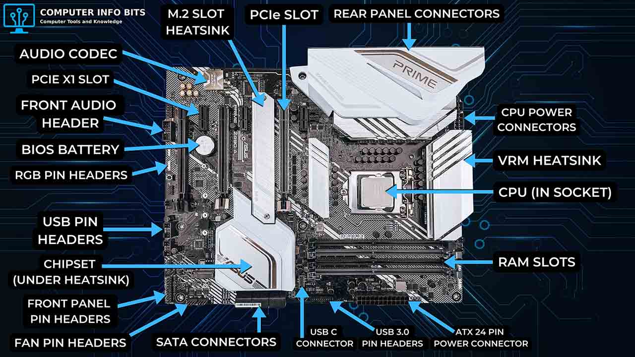 A complete breakdown of every major motherboard component including the CPU socket, chipset, RAM slots, PCIe slots, SATA ports, M.2 connector, BIOS chip, and rear I/O panel.